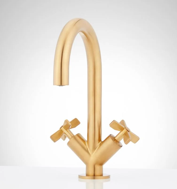 Single Hole Bathroom Faucet w Arched Spout and X Levers in Gold